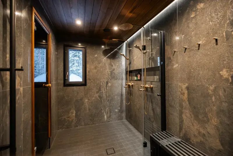 Sauna ja kylpytilat kannattaa suunnitella huolella, sillä ne ovat usein ahkerassa käytössä. Materiaalivalinnoilla ja ylellisillä yksityiskohdilla voit luoda spa-tunnelman, joka hipoo täydellisyyttä. Ulkoporeamme tunturinäkymillä kruunaa kokonaisuuden.