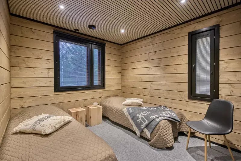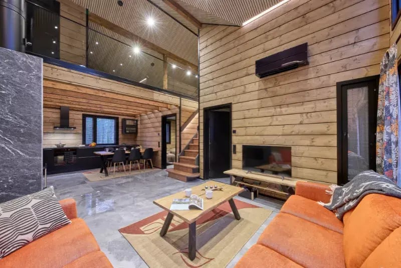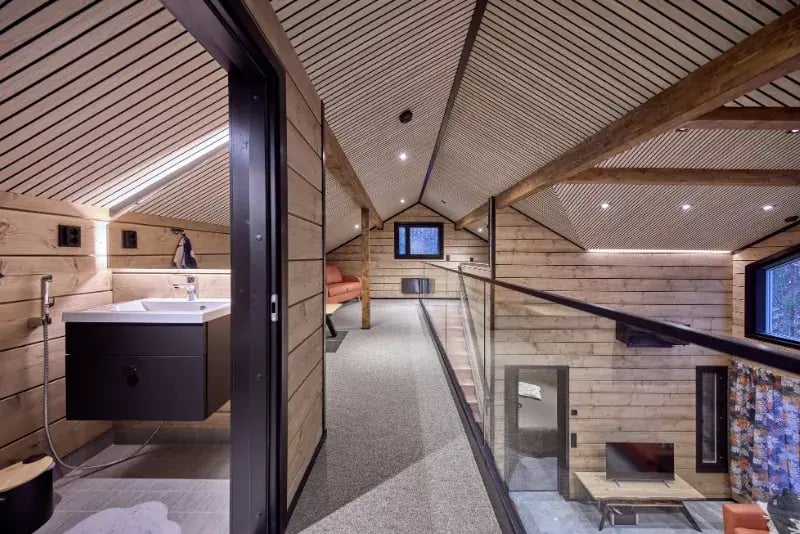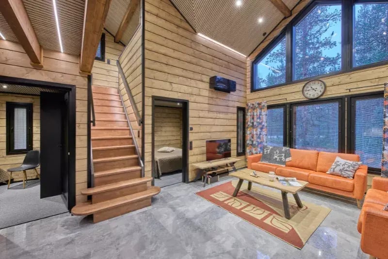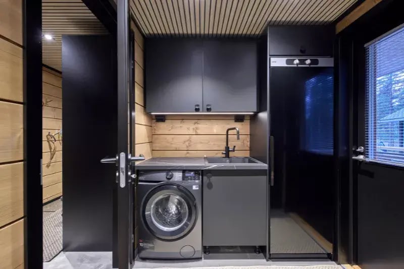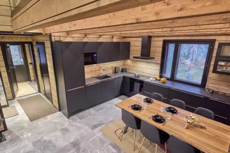 Sisustusvärinä mustat ovet ja keittiö tuovat kontrastia lämpimän puun sävyille.